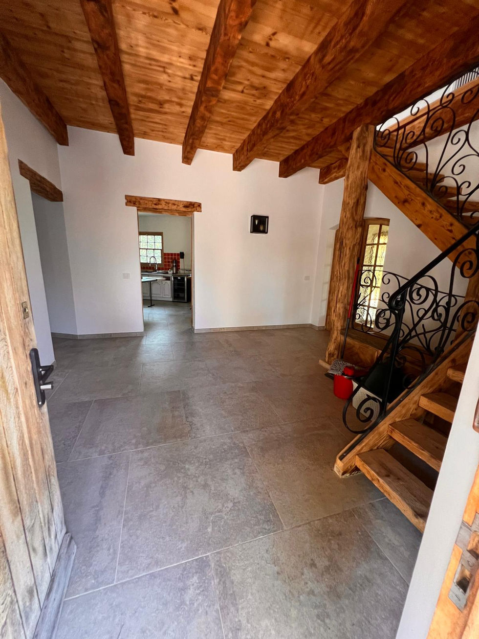 Large entrance hall that provides access to the kitchen (straight ahead), separate toilet (to the left), corridor to the bedrooms on the ground floor (to the left), living room (to the right), and stairs to the upper floor (to the right).